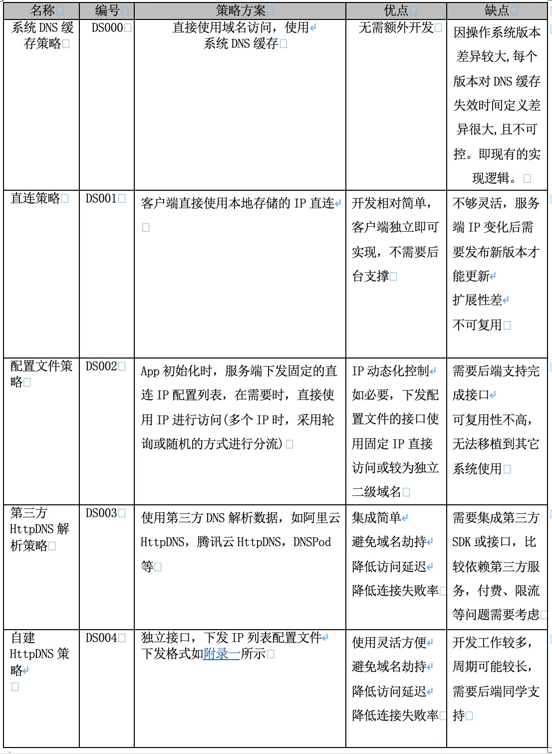 尽量消除因外部网络原因(如外部DNS解析异常、域名不可达等)导致的App出现网络异常的问题。 经过调研,我们总结了下面的几种方案来防止类似问题再次发生,对比之后,我们最终也选择了部分策略做为我们的分批落地方案(步骤后续会详细讲解)。 我们的希望App达到避免DNS劫持,降低访问延迟,降低用户连接失败率,提升用户体验度,SDK高可扩展度及可复用性。