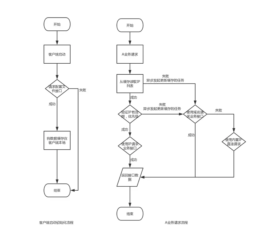 当App启动时,从缓存读取出来配置,并验证有效期。如全部过期,则使用域名或系统内置的IP使用;如部分未过期或全未过期(其实大部分情况下,即使IP过期,在一定时间段内还是有效的),则按照优先级次序使用IP地址直连请求;