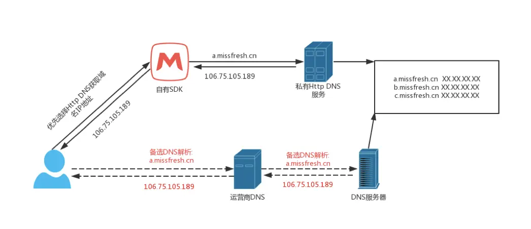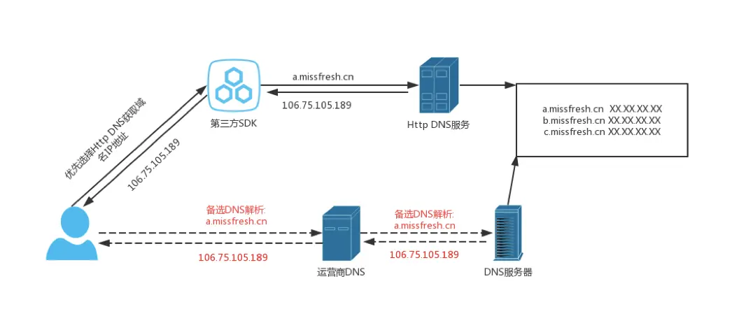 自建HttpDNS就是提供私有的DNS解析服务,以Http或Https的方式向外提供服务。严格来讲,此方案不是降级策略,而是使用自建DNS替代系统DNS拿到直连IP进行网络请求,而把系统级的缓存作为最后的降级方案。