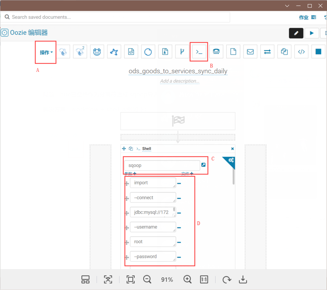 HUE使用sqoop导入hive 陈浮生 2019-10-28 398 阅读1分钟 正文问题1:hue以空格作为分隔符造成 sqoop导入hive的命令失败解决方案:workflow + shell 示例如下: 1. 新建workflow 2. A处选择 操作 3. 拖拽 B 处 到 C的位置,下面为C 位初始状态 4.在D处添加参数 填写参数注意空格 有些参数(例如query后面的sql语句)要手动输入参数中的空格 填写完后记得检查 有没有参数粘连成一个参数了 坑了我2天。。。问题2:loading...正文结束