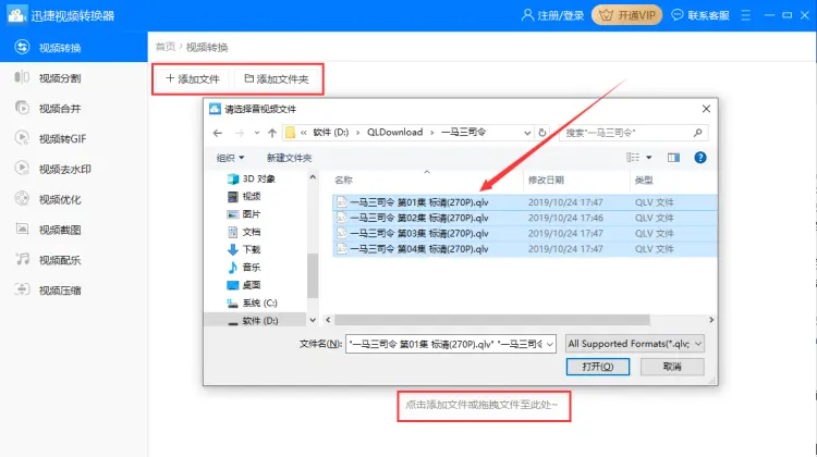 1、首先把通过各种途径下载好的qlv格式的视频添加迅捷视频转换器中。添加的时候可以点击软件左上角的添加文件/添加文件夹按钮,也可以直接用拖拽的方式添加视频。