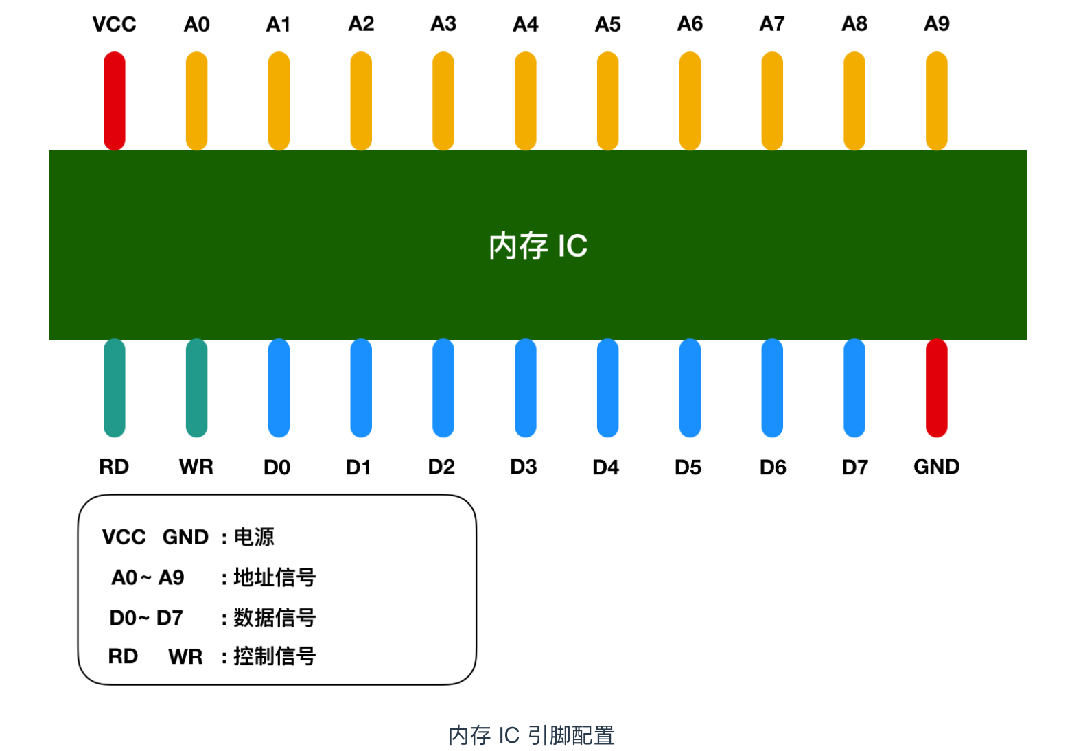 内存 IC 是一个完整的结构,它内部也有电源、地址信号、数据信号、控制信号和用于寻址的 IC 引脚来进行数据的读写。下面是一个虚拟的 IC 引脚示意图