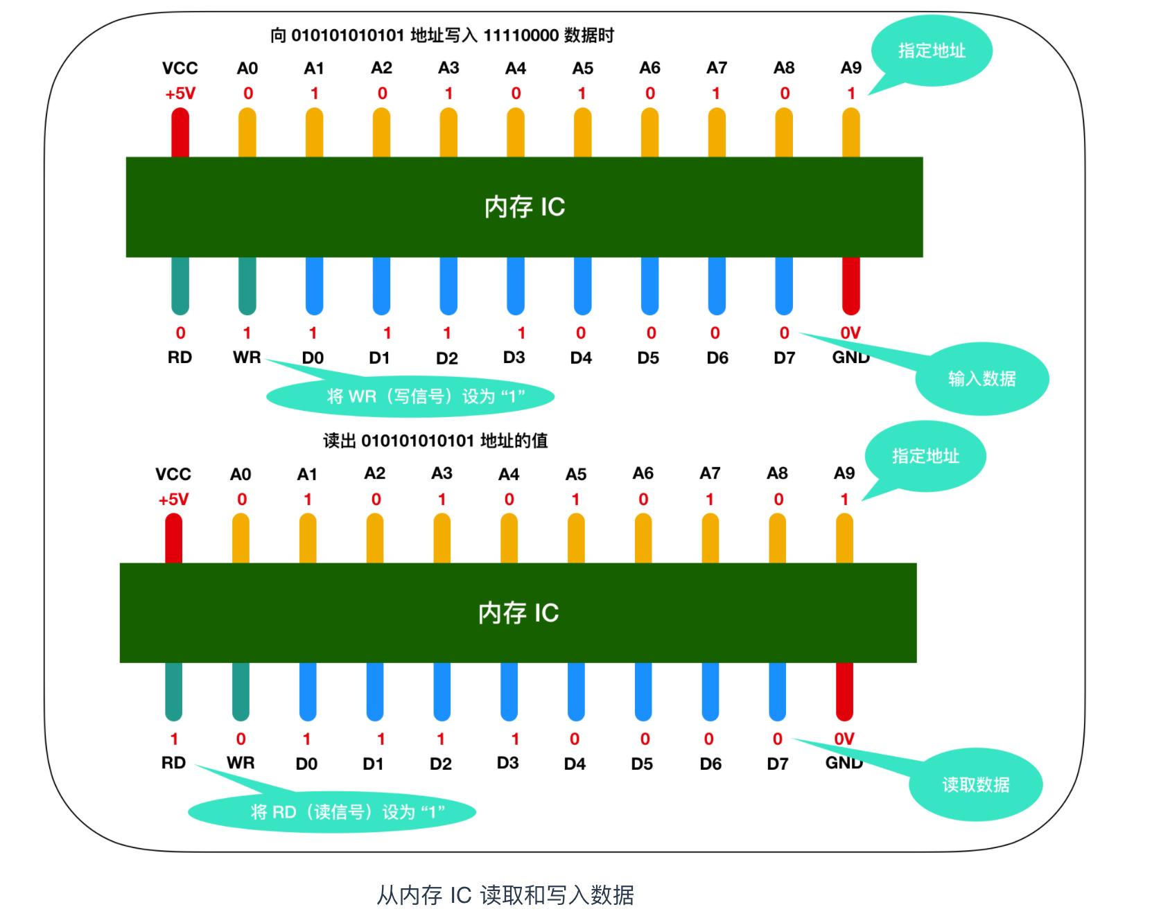 A0 - A9来指定数据的存储场所,然后再把数据的值输入给D0 - D7的数据信号,并把WR(write)的值置为 1,执行完这些操作后,即可以向内存 IC 写入数据 - 读出数据时,只需要通过 A0 - A9 的地址信号指定数据的存储场所,然后再将 RD 的值置为 1 即可。