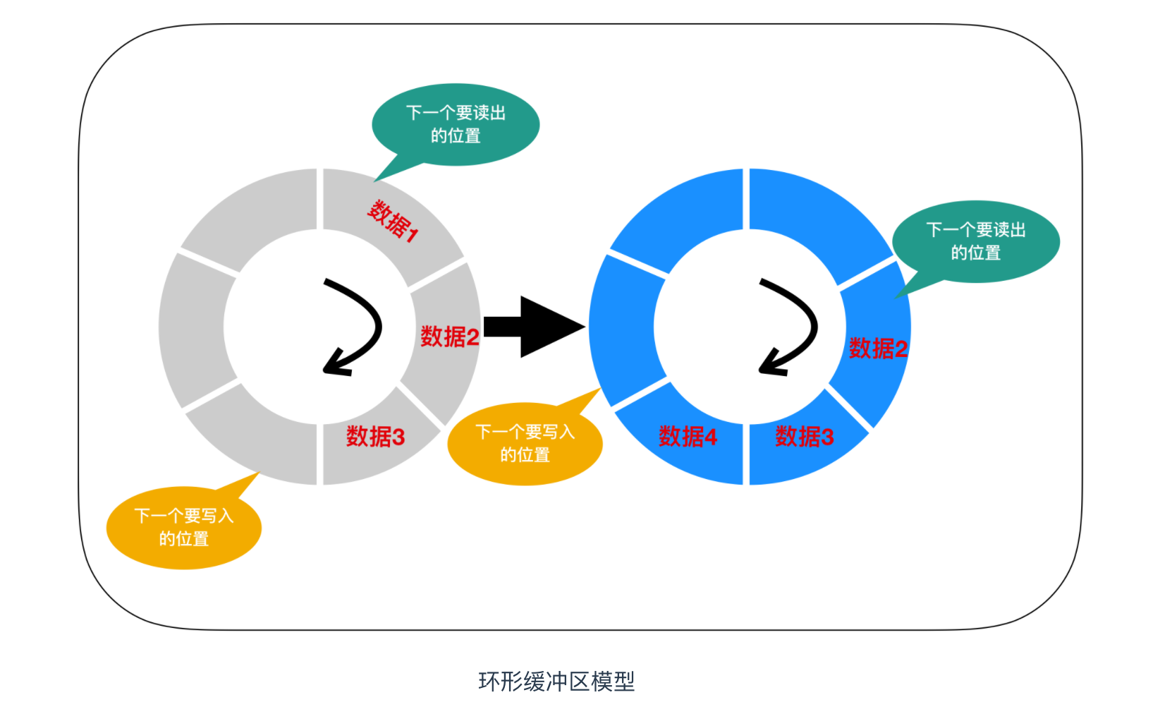 循环队列一般是以环状缓冲区(ring buffer)的方式实现的,它是一种用于表示一个固定尺寸、头尾相连的缓冲区的数据结构,适合缓存数据流。假如我们要用 6 个元素的数组来实现一个环形缓冲区,这时可以从起始位置开始有序的存储数据,然后再按照存储时的顺序把数据读出。在数组的末尾写入数据后,后一个数据就会从缓冲区的头开始写。这样,数组的末尾和开头就连接了起来。