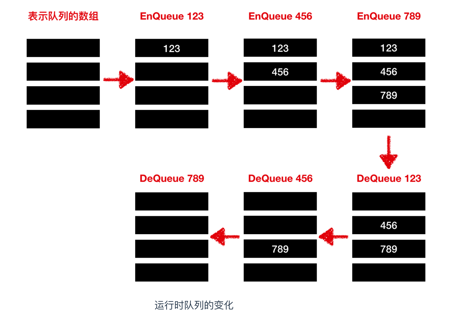 向队列中写入数据称为 EnQueue()入列,从队列中读出数据称为DeQueue()。