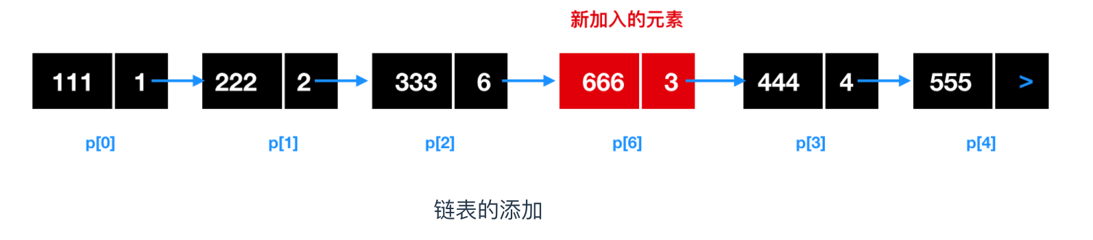 那么对于新添加进来的链表,需要确定插入位置,比如要在 p[2] 和 p[3] 之间插入地址为 p[6] 的元素,需要将 p[6] 的前一个位置 p[2] 的指针域改为 p[6] 的地址,然后将 p[6] 的指针域改为 p[3] 的地址即可。