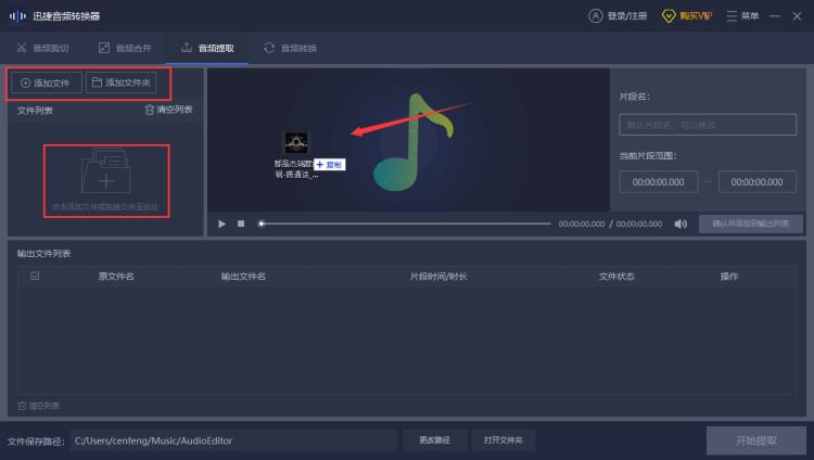 3、视频添加好后会出现一个视频预览框,我们需要在当前片段范围或移动黄标设置音频提取的开始时间和结束时间,设置好后确认并添加到输出列表中。
