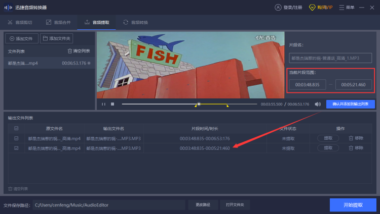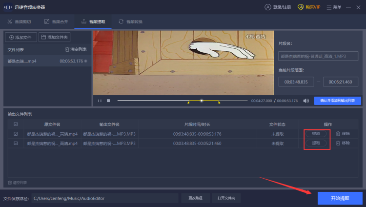 4、之后点击提取按钮或开始提取按钮统一把列表中待转换的片段从上往下转换成mp3格式提取出视频中的音频片段。