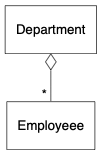 聚合(aggregation)是一种特殊的关系,是一种弱的包含关系,包含方以空心菱形表示。例如,一个部门含有一些员工:
