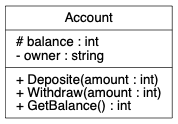 <visibility> <method name> (<param1 name> : <param1 type>, ...) : <return type>Graphviz 可使用 record shape 或 HTML table 来分隔类名字、属性和方法,例如以下的 C++ 类: