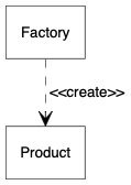 依赖(depedency)关系说明一个类会使用到另一个类,例如表示以一个类作为成员方法的参数或返回值。UML 中采用线形箭头和虚线表示。以下的例子表示工厂创建产品,常见于各种工厂模式,工厂不拥有产品。