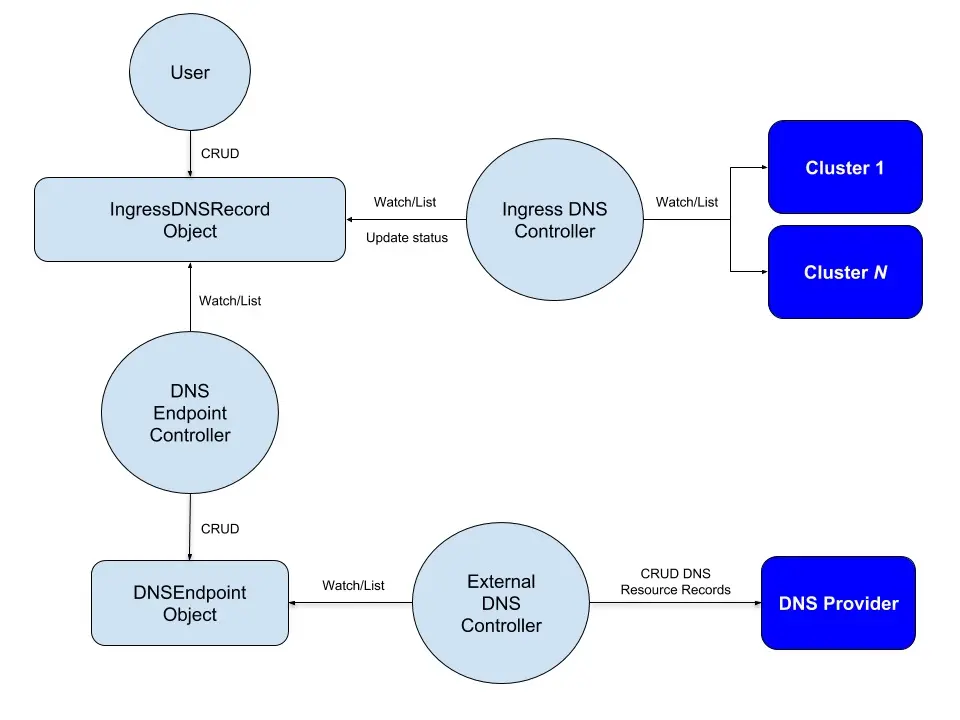 ExternalDNS controller 会监听 DNSEndpoint 资源,收到事件后会将该记录应用到 DNS 服务器上,如果成员集群的内部 DNS 服务器使用该外部 DNS 服务器作为上游服务器,那么成员集群可以直接访问对于域名就可以实现跨集群访问。