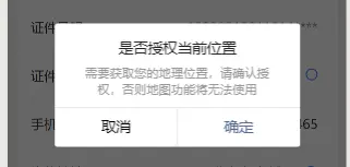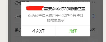 第一步检测用户有没有授权wx.getSetting(),没有授权就发起授权请求wx.authorize(),此时会出现弹窗:如果点击允许就会进入地图进行选择,如果点击不允许就授权失败,小程序只会做一次授权,接下来的n此触发都会直接进入fail,不会再次出现弹窗。