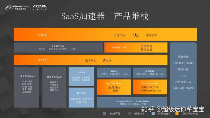 我们在顶层,在商业侧我们通过阿里云的云市场给大家提供一个一站式的商业平,包括获客、推广、转换、交易包括售后的服务。这是一个一站式的商业平台,然后生态的SaaS产品都可以放在这个商业平台上面做售卖。