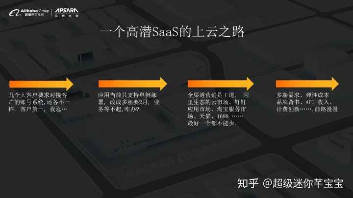 我们今天聊的这个企业应用上云仅仅包含这个吗?我们一起看一下高潜SaaS的上云之路,今天在座的只要手上有一款产品,通过互联网对外提供服务,不管服务的是企业用户还是个人用户,都可以称之为一个高潜SaaS。