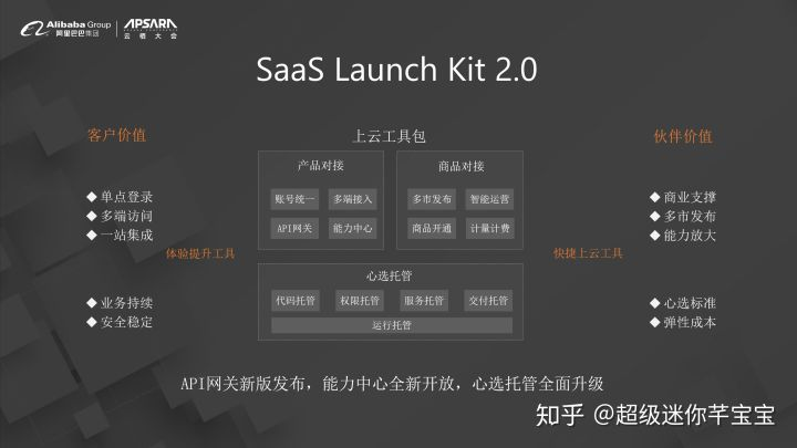 大家可以看到,一个SaaS要从产品可用到最后的商用成功,其实面临的挑战是非常巨大的,我们刚刚只举了三个例子,事实上一个SaaS要走向商业成功会碰到形形色色的问题。比如说他会碰到客户需要有多个端,他可能不喜欢微信端,喜欢钉钉端,也有可能反过来,也有可能喜欢企业自有端之类的。SaaS也会有弹性成本的考虑,比如说“双十一”突然订单爆增,他的系统突然间撑不住了。 又比如,他自己的品牌力量不够,需要积累自己的品牌资产,但在品牌资产积累到足够强大之前,他能否先找一颗大树靠靠。当然他还想拥抱API经济的浪潮,可能会去想到尝试一些商业模式的创新,都需要有人帮他把想法或者需求实现,也能解决客户的痛点,这个时候怎么办呢,光上一个IaaS够吗?
