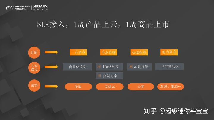 SLK接入从一开始起步到最后在云端能一览众山小,需要多久?这里我们郑重承诺,一个满足基本条件的SaaS,我们希望一周内产品上云,一周内商品上云,这是我们对一个企业应用上云速度的一个期望,我们甚至希望SaaS的同学和伙伴能够根据文档自主完成,而不需要打很多的电话或者是在群里聊很久。