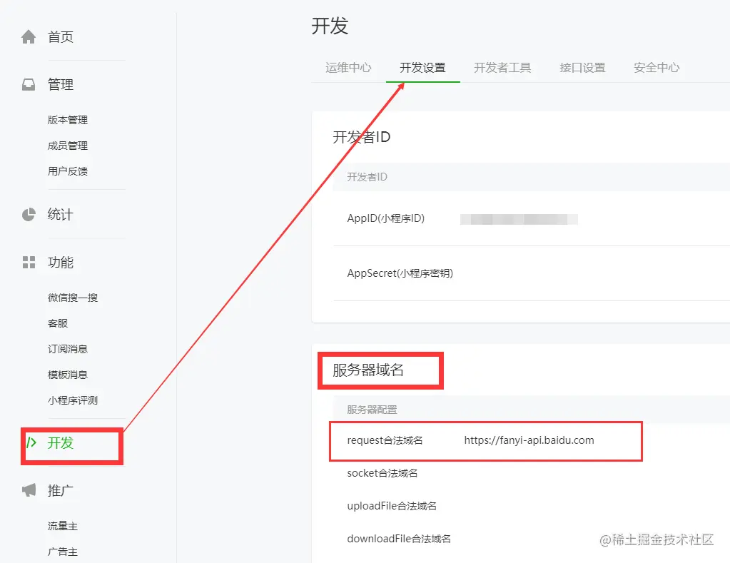 - 去开发里面的开发设置添加服务器域名,request合法域名填写百度api地址,如下图: