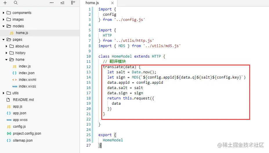config.js:配置基础域名、小程序ID、百度翻译key以及状态码定义