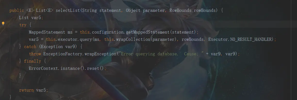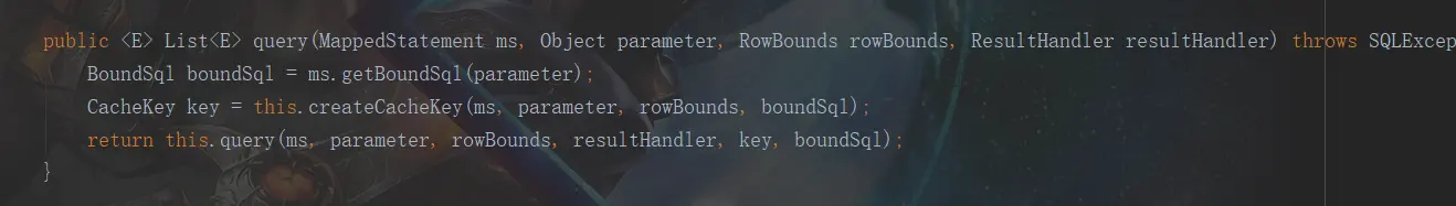 首先就是获取相关的MappedStatement对象,因为之前解析好的sql语句片段都放在了这个对象中,那么根据什么获取呢,因为在解析配置文件的时候就知道了我们写的查询方法跟Mapper*.xml是绑定了的,所以就可以根据 namespace的id + 方法名的id去获取到这个对象,这也是为什么说namespace的id要唯一,不然你就获取不到这个对象了。继续跟进这个query()方法