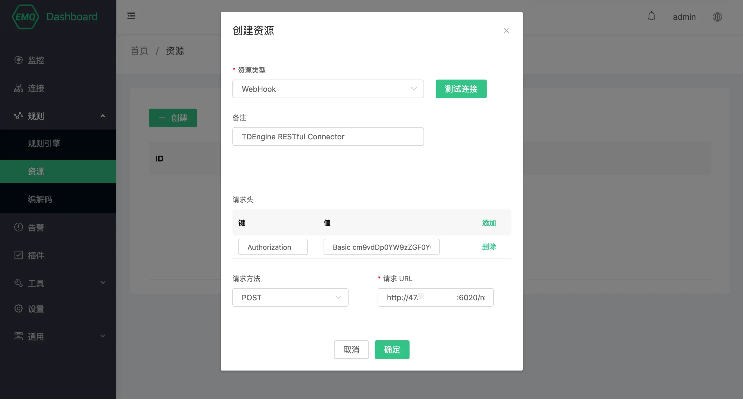 EMQ X Dashboard 中点击 规则 主菜单,在 资源 页面新建一个 WebHook 资源,用于向 TDEngine RESTful Connector 发送数据,新增请求头: