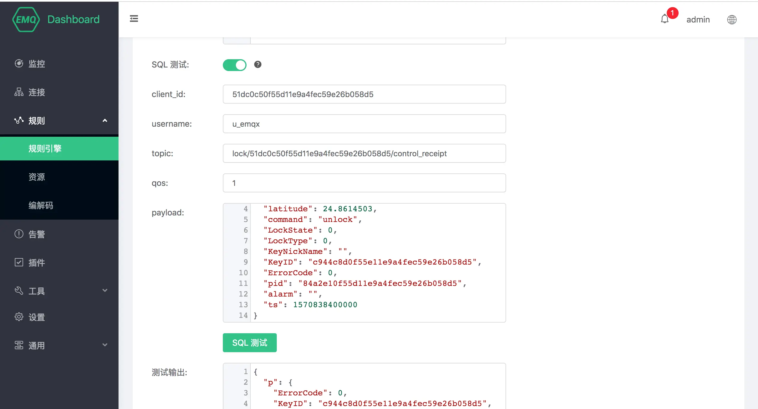使用 SQL 测试功能,输入原始上报数据与相关变量,得到如下输出结果:
