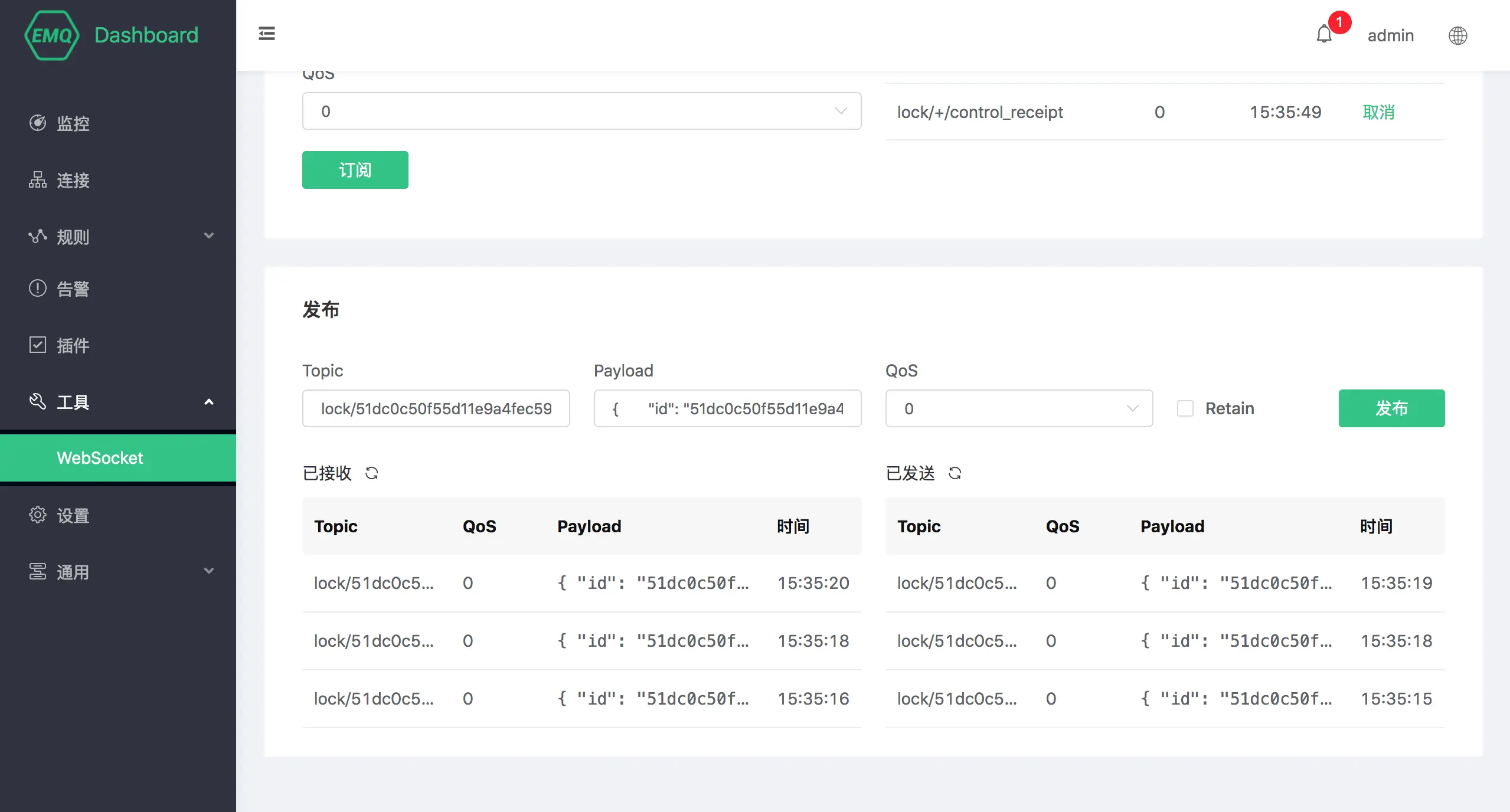 通过 EMQ X Dashboard 内置的 MQTT 客户端(WebSocket)可以快速模拟测试规则可用性。打开 工具 -> WebSocket 页面,输入按照智能门锁连接信息建立连接,在 发布 功能里面输入上报主题、上报数据点击发布进行模拟测试: