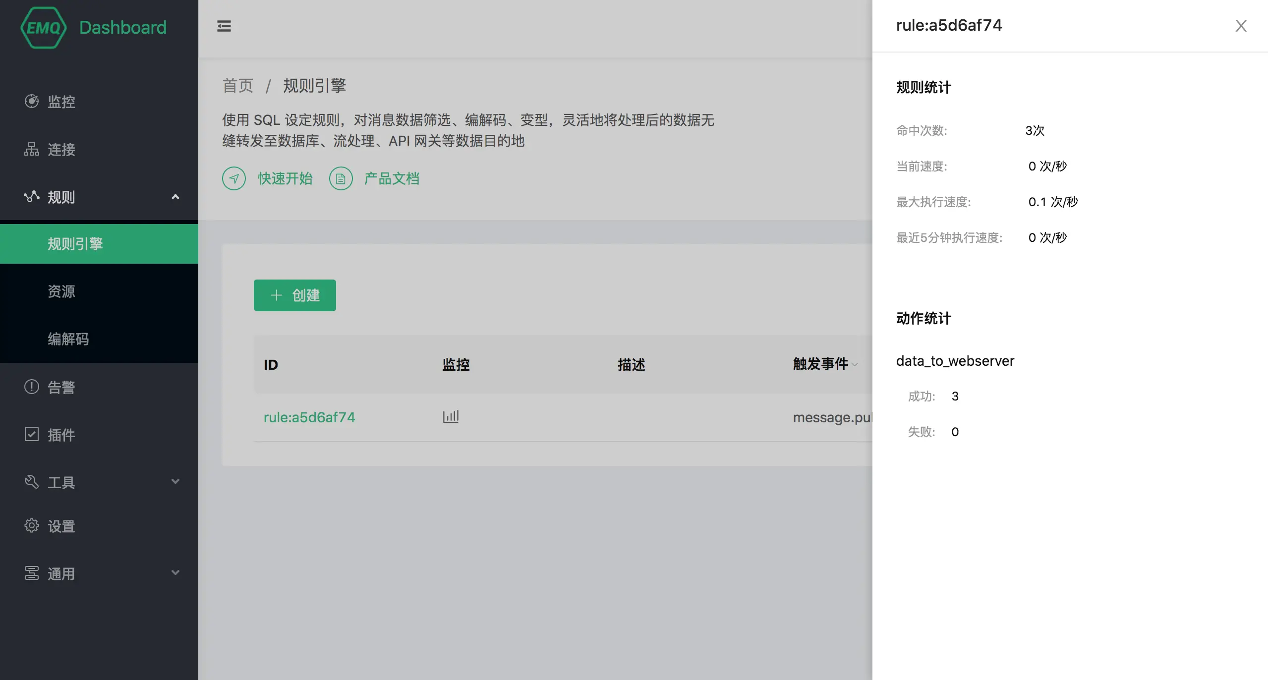 发布多次,在 规则引擎 列表里,点击 监控 图标可以快速查看当前规则执行数据,由下图可见 4 条消息命中 3 次,成功 3 次: