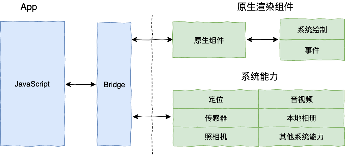 - Web 容器时代 主要采用的是原生应用内嵌浏览器控件 WebView(iOS 为 UIWebView 或 WKWebView,Android 为 WebView)的方式进行 HTML5 页面渲染,并定义 HTML5 与原生代码交互协议,将部分原生系统能力暴露给 HTML5,从而扩展 HTML5 的边界。这类交互协议,就是我们通常说的 JS Bridge(桥)。 这种开发模式既有原生应用代码又有 Web 应用代码,因此又被称为 Hybrid 开发模式。