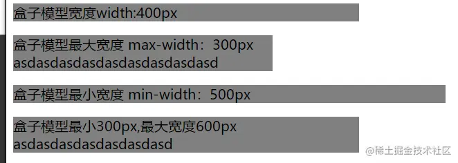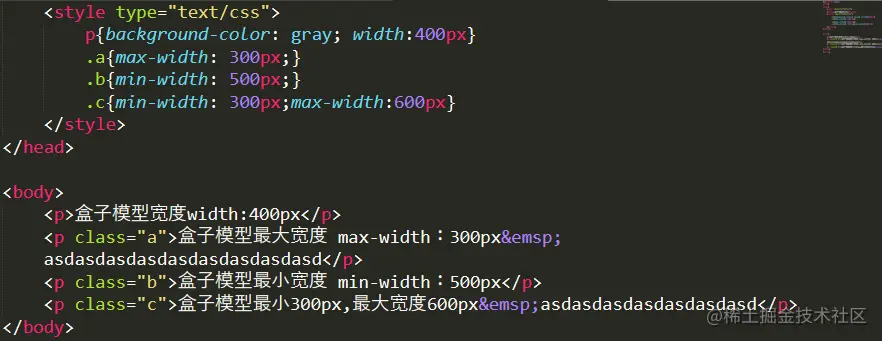 由于min-width限制第三段的最小宽度,只能接受比他大的值,所以对整个<p>标签400px的宽度设置,对他不起作用。