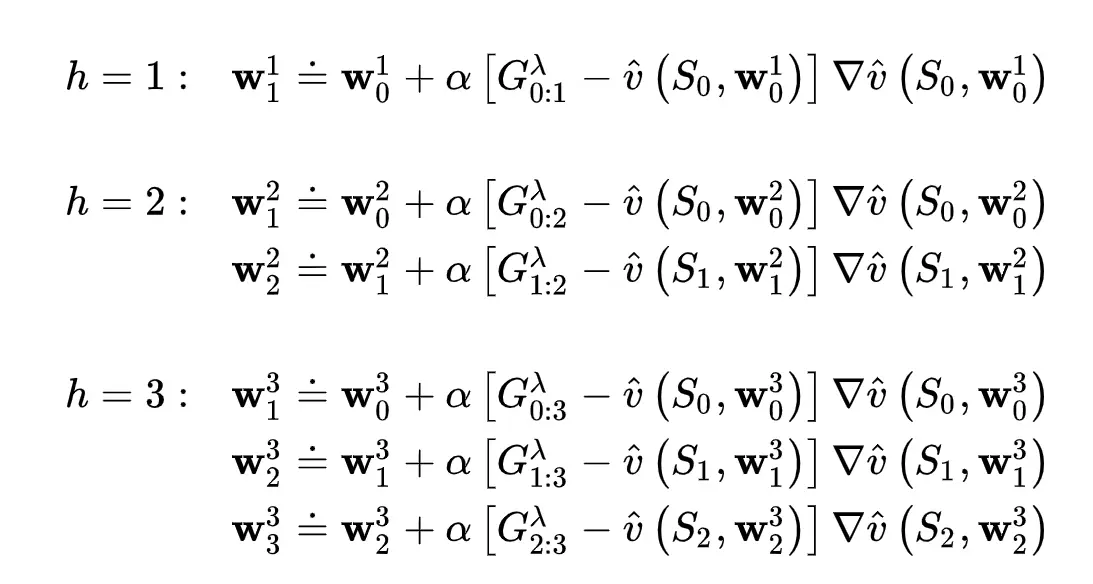 本节介绍的 TD( λ ) 对上一节的 offline λ -return 有三点提升: