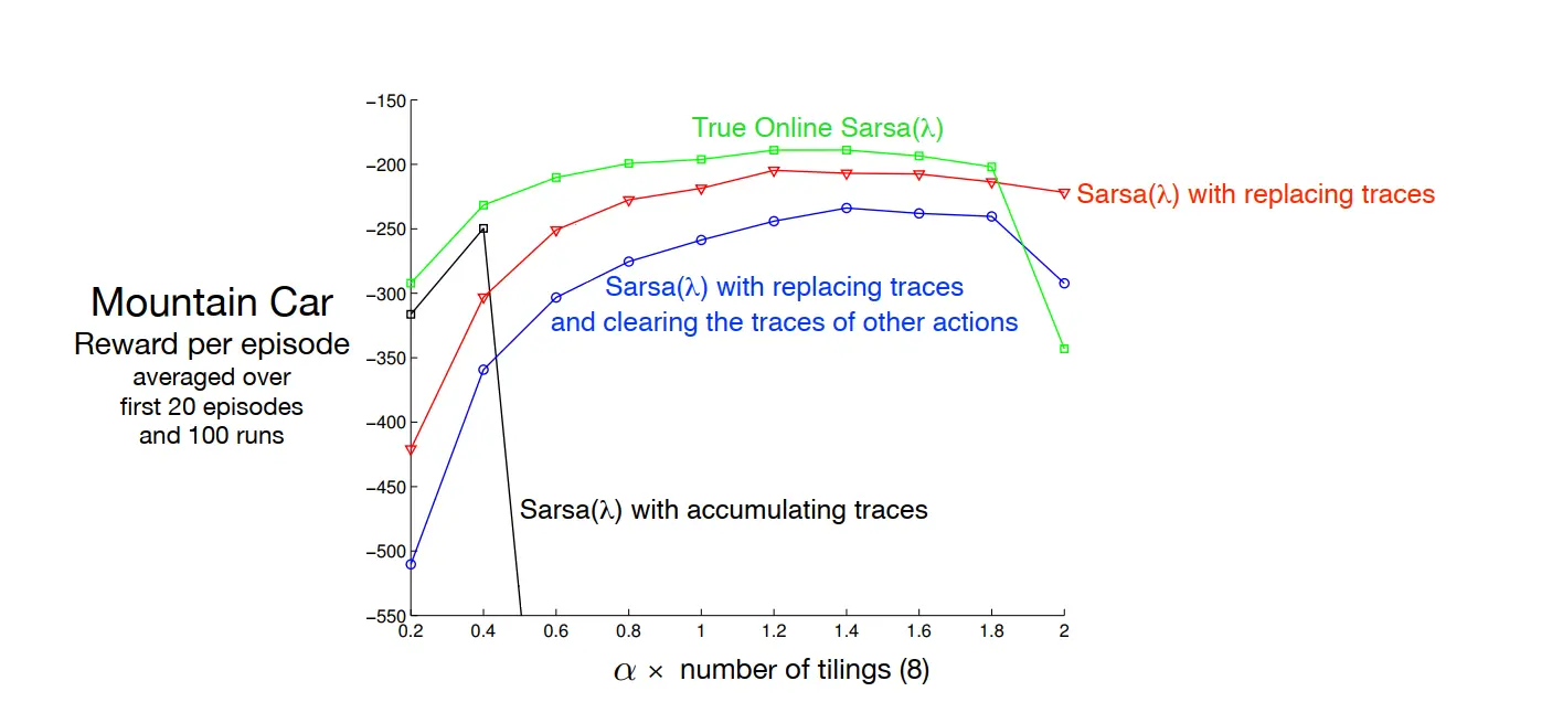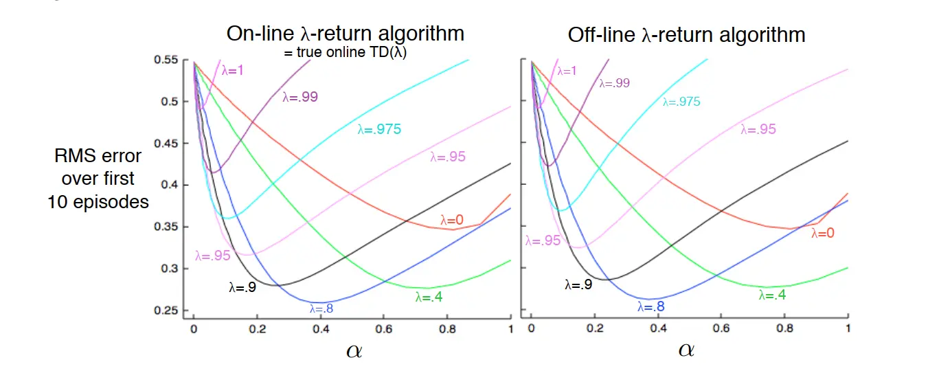 ① 和n步算法相比,使用trace的TD方法性能大幅度提升(学习速度更快),缺点是计算量变大了(因为他需要在每个时间点对所有状态做更新),但是计算量不会非常大(因为实际中绝大多数 state 的 trace 都为 0)