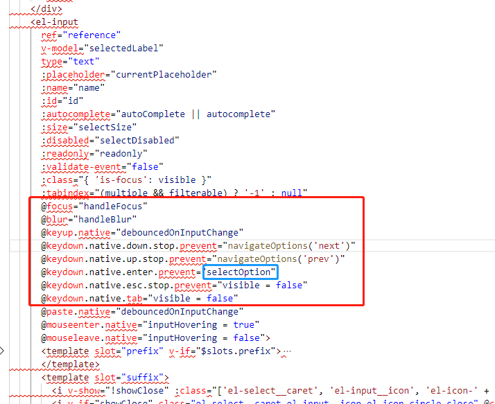 首先我们可以迅速找到 el-select 里放着个 el-input 并且写了很多 keydowm 相关事件. 并且根据需求, 我需要改写 keydown 的 enter 事件对应的 selectOption 方法.