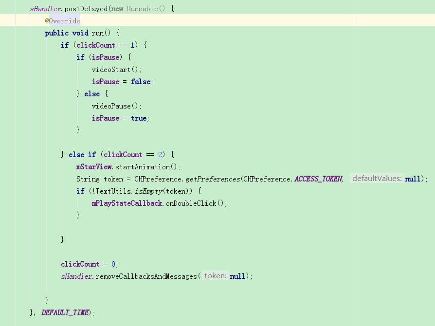 实现双击 可以使用handler.postDelayed. Default_time为400毫秒。代码中既有单击,又有双击。
