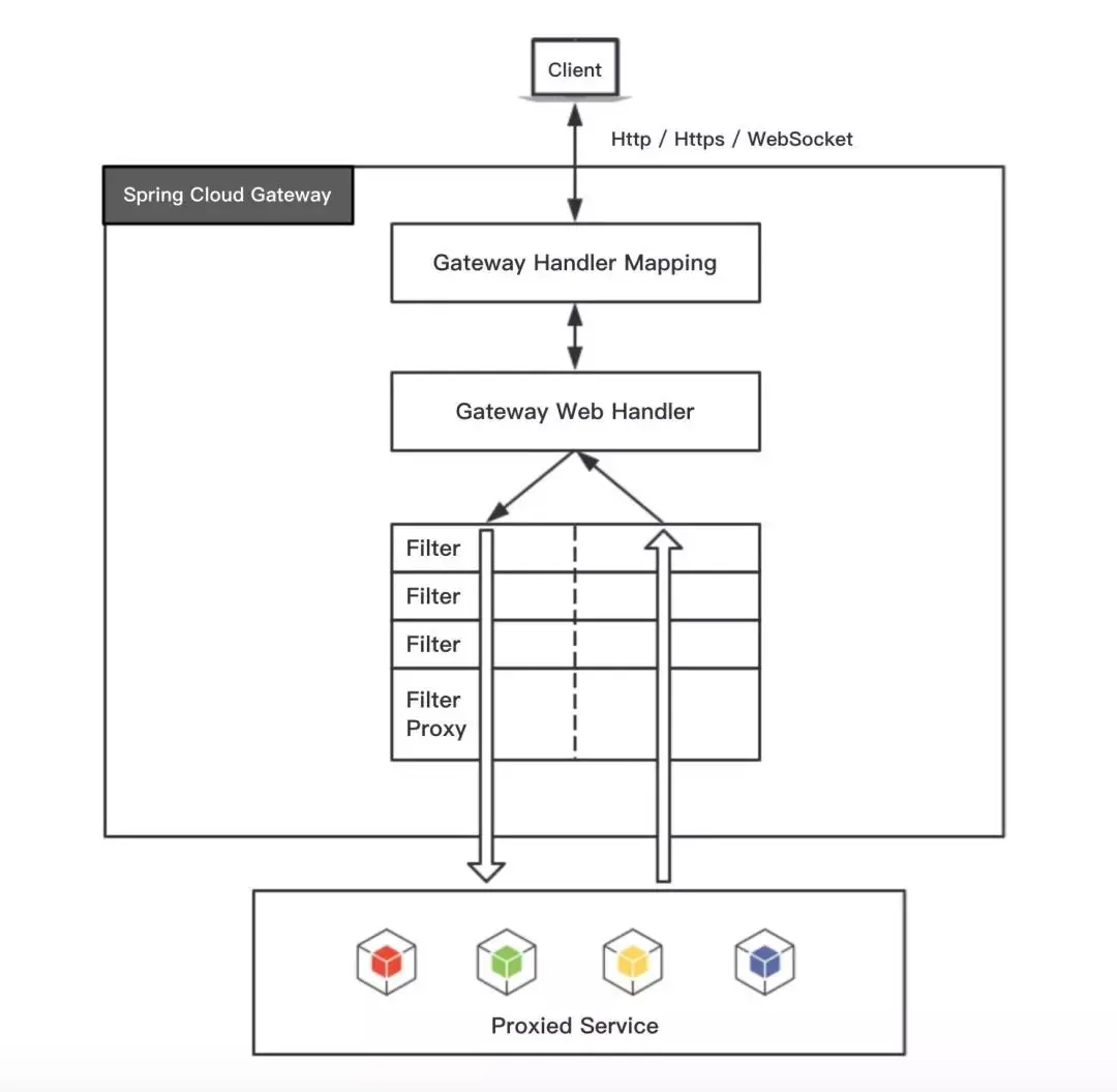 客户端向 Spring Cloud Gateway 发出请求,如果请求与网关程序定义的路由匹配,则将其发送到网关 Web 处理程序,此处理程序运行特定的请求过滤器链。