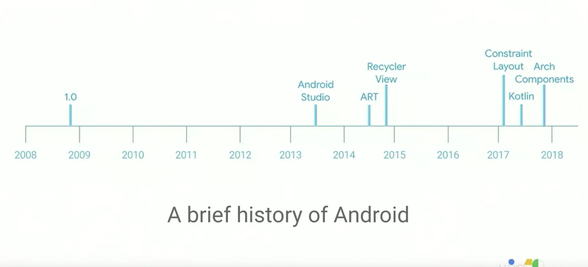 时间让我们回到5个月前的 I/O 大会,当时演讲者为大家分享了这样一张图,这是一张 Android 10 年里的简要发展历史,在长达 10 年的发展过程中,Google 针对不同的问题做出了很多的调整,但是唯独在 UI 构建方面,最初的那一套 UI 构建体系一直沿用至今,几乎没有做任何调整。