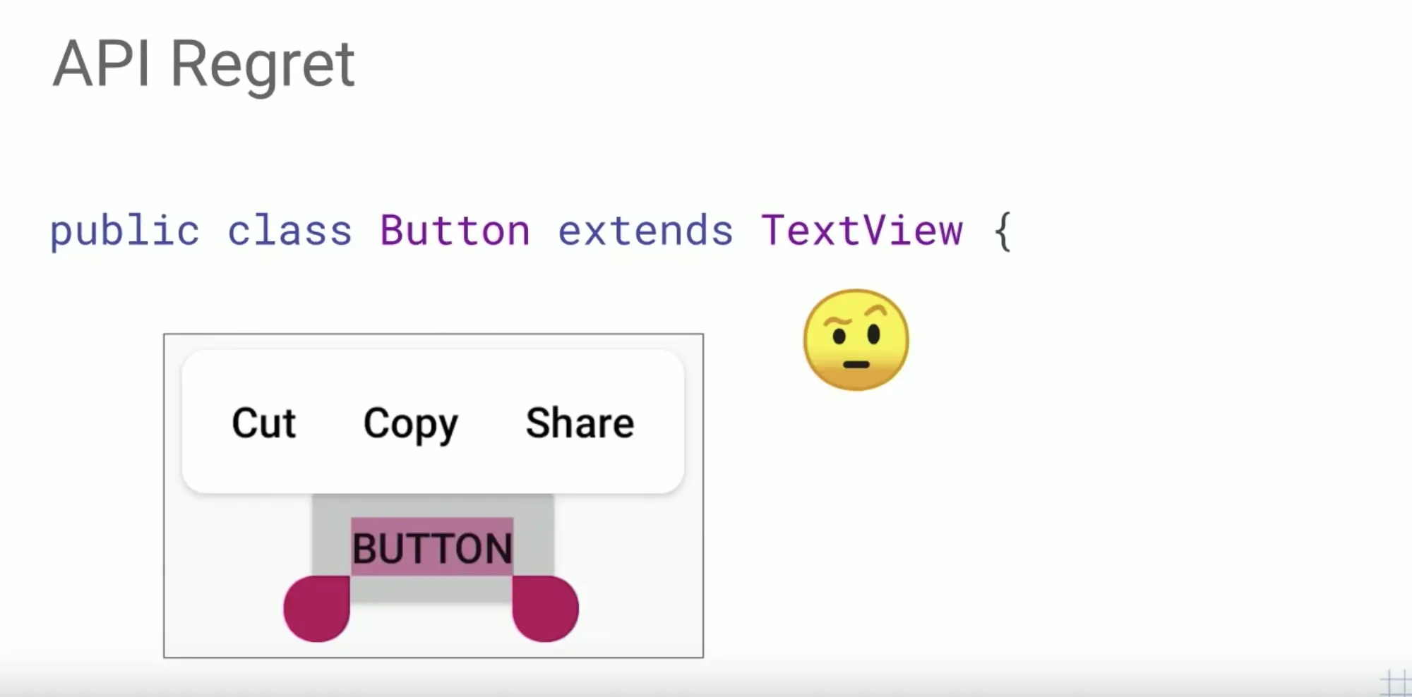 例如我们都知道 Button 继承自 TextView,理论上我们只需要一个文本 + 可点击的区域就可以了,但是由于 TextView 的特性,它本身是可以长按出现复制、选择功能的,但是我一个 Button 要这些功能有什么用呢?应该不会有产品或者设计会需要我们做一个可以复制剪切文本的 Button 吧?同学们应该听过一句话就是:组合优于继承,同样这也是 Jetpack Compose 的核心,所有的 UI 都是通过组合实现,不存在继承关系。