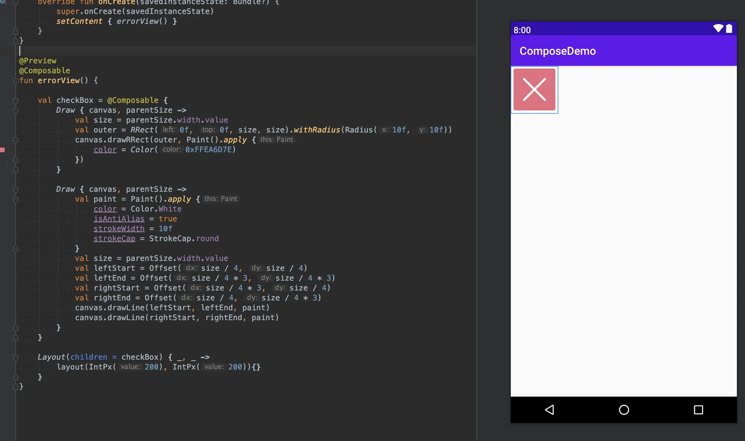 除了内置的 UI 组件之外,Jetpack Compose 中实现自定义 View 的过程也非常简单,我们只需要关注 Draw 和 Layout 这两个方法就好了,这里我绘制了一个错误框,粉色的背景+白色的X,过程和之前一样,还是经过 measure、layout、draw ,但在写法上非常精简。