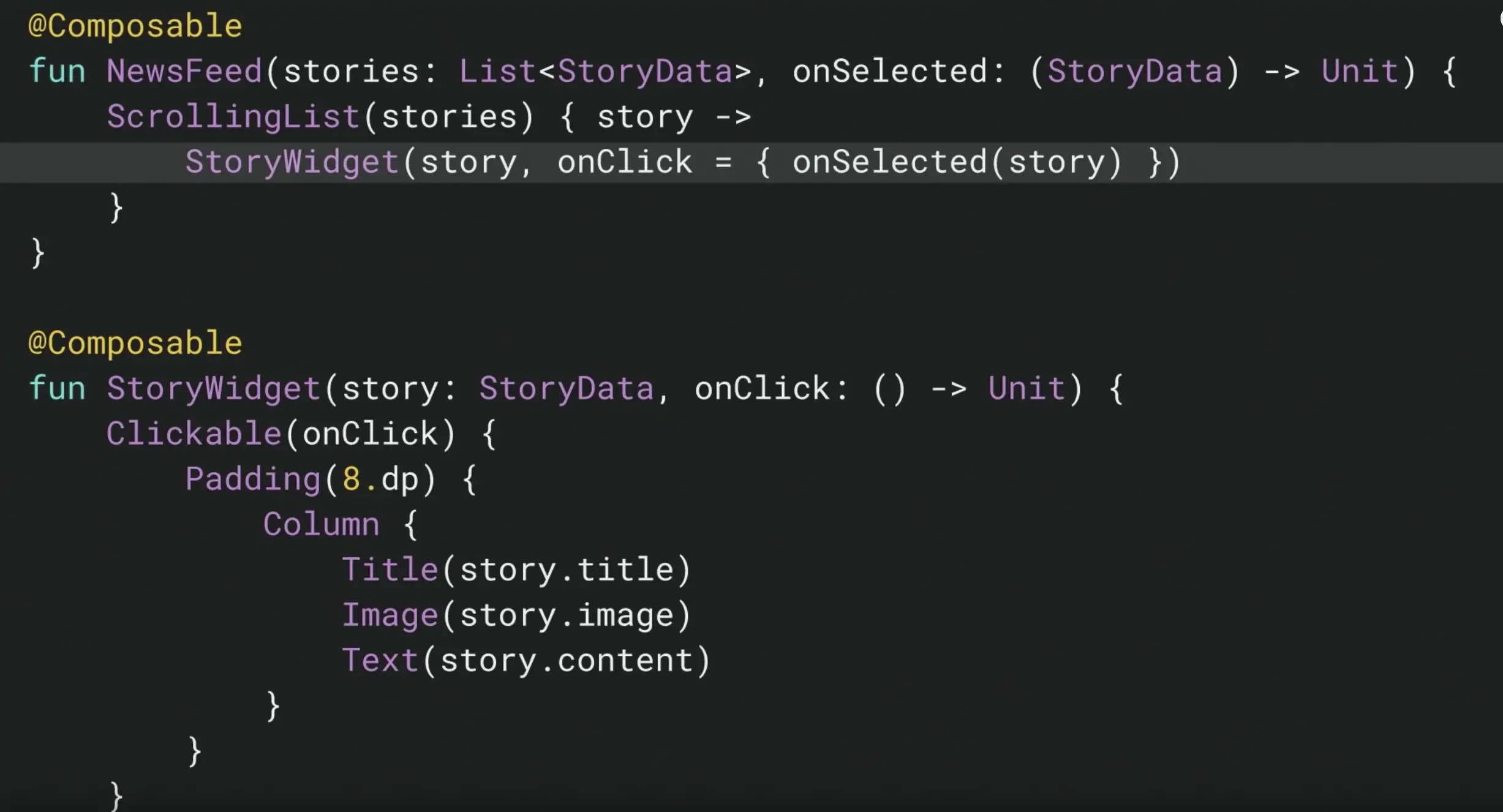 Jetpack Compose 采取单一向下数据流和单一向上事件流的方式构建 UI。简单来说,就是由父组件向子组件传递数据,子组件通过数据构建 UI,当子组件发送交互事件时,通过Lambda 方法将行为的发生交与父组件处理,父组件处理后修改数据,再通过单一向下数据流的原则通知子组件变化。这里通过一段简单的代码,向大家介绍这种构建方式: