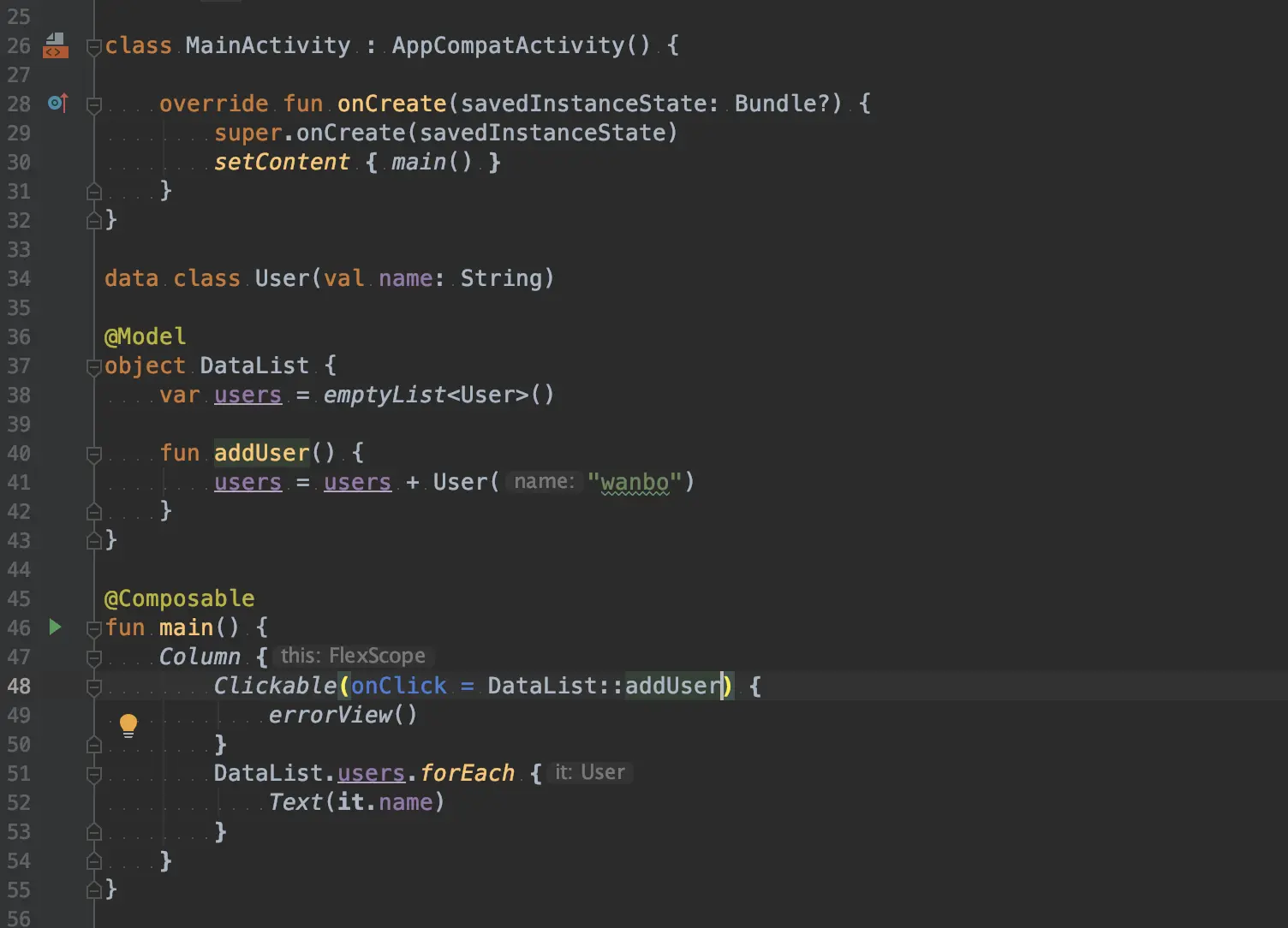 这里我又又又写了一个例子,布局方面是一个纵向的列表,第一项是我们之前写的那个错误框,通过给它包装一层 Clickable 将它变成可点击的 View,onClick 就是我们点击时执行的方法,错误框下面是纵向排列的 Text,有多少条数据就有多少条 Text。数据方面 DataList 是我们创建的一个维护数据的类,你可以看到它被 @Model 注解所标识,那么就意味着,我们 DataList 中的 users 是一个可监听对象,当我们执行点击事件插入数据的时候,位于 @Composable 方法中的 DataList.users 会自动收到更新,然后执行循环体,更新 UI。