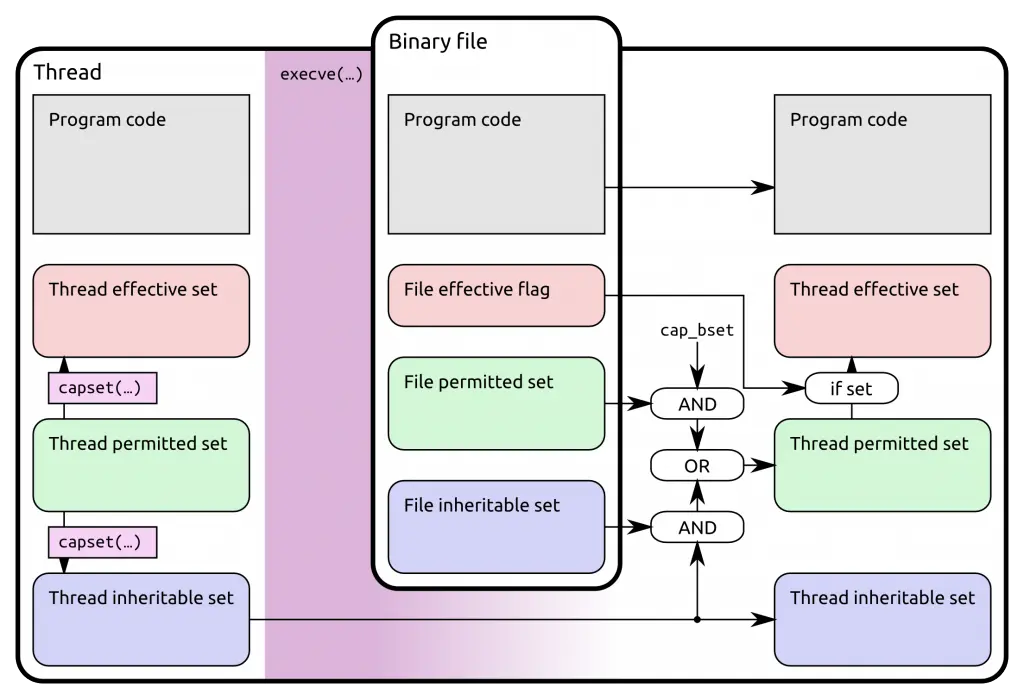 execve()前线程的Inheritable集合与可执行文件的Inheritable集合取交集,会被添加到执行execve()后线程的Permitted集合;可执行文件的 capability bounding 集合与可执行文件的Permitted集合取交集,也会被添加到执行execve()后线程的Permitted集合;同时执行execve()后线程的Ambient集合中的 capabilities 会被自动添加到该线程的Permitted集合中。 - 如果可执行文件开启了 Effective 标志位,那么在执行完