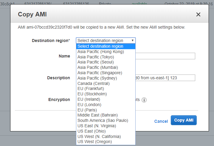 如何将EC2实例迁移到别外一个Region 此处省略三个字 2019-10-29 209 阅读1分钟 1、暂停ec2实列2、创建一个镜像3、查看镜像4、复制镜像到别的区域5、切换到复制到的可用区,在AIMS中找到自己复制的镜像
