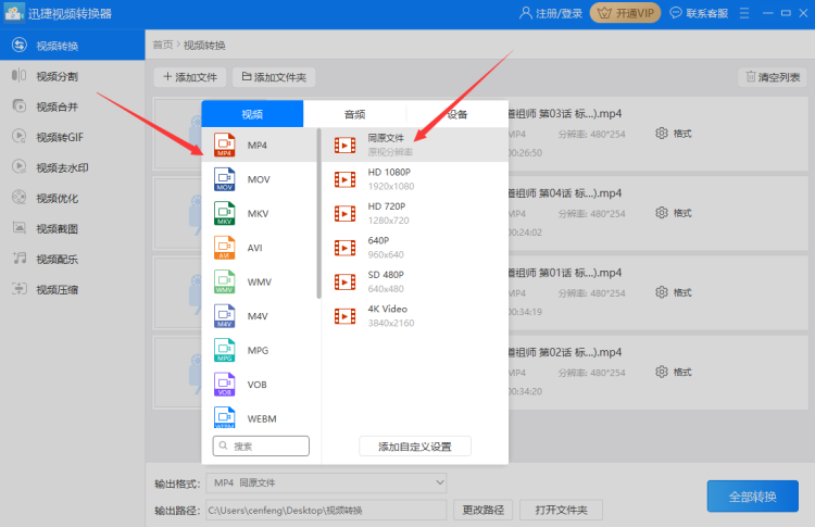3、然后在输出格式中设置好输出的视频格式和视频分辨率,由于我们要把qlv格式转换成mp4因此把视频格式设置为‘mp4’,视频分辨率则通常保持为和原视频相同的‘同原文件’格式。