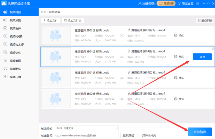 5、最后点击鼠标悬停时出现的转换按钮或直接点击右下角固定的全部转换按钮就可以把添加好的qlv格式从上往下依次转换为需要的mp4格式并输出到指定路径中。