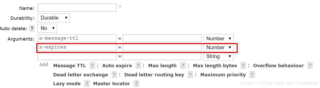 x-message-ttl为5000,则表示消息超过5秒没被处理就会超时过期; x-expires设置120000表示队列在2分钟内没被消费则被删除;x-max-length,x-max-length-bytes表示传送数据的最大长度和字节数x-dead-letter-exchange,x-dead-letter-routing-key表示死信交换机和死信路由,放在需要过期或处理失败的队列属性中,这些数据会转发到死信队列存储起来,创建普通的交换机和队列绑定,把交换机名填到x-dead-letter-exchange的值,填写路由键要符合死信队列的路由键x-max-priority,表示设置优先级,范围为0~255,只有当消息堆积的时候,这个优先级才有意义,数字越大优先级越高x-queue-mode当为lazy,表示惰性队列,3.6.0之后才被引入的概念,相比默认的模式,惰性队列模式会将生产者产生的消息直接存到磁盘中,这当然会增加IO开销,但适合应对大量消息堆积的情况;因为当大量消息堆积时,内存也不够存放,会将消息转存到磁盘,这个过程也是比较耗时且过程中不能接收新的消息。如果需要将普通队列转换成惰性队列需要将原来的队列删除,重新创建个惰性队列绑定。