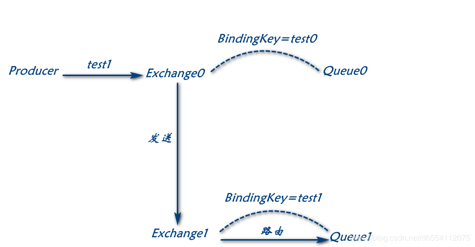 exchange0设置了alternate-exchange交换机为exchange1,生产者发送数据到exchange0路由键为test1,在exchange0路由不到,则转发到exchange1判断路由符合,发送到队列queue1