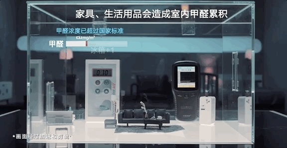 可以看到,原本甲醛浓度符合国家标准的实验盒,随着实验人员不断往里面添加家具和各种生活用品,甲醛浓度数值逐渐攀升,直至超过国家标准规定的 0.1mg/m³。