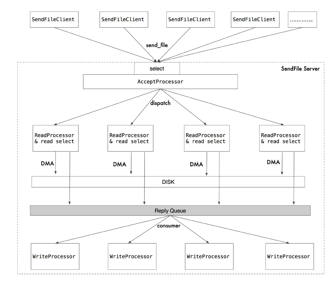 readProcessor 在读到数据后,会将其写入到磁盘中(DMA 的方式,性能炸裂)。