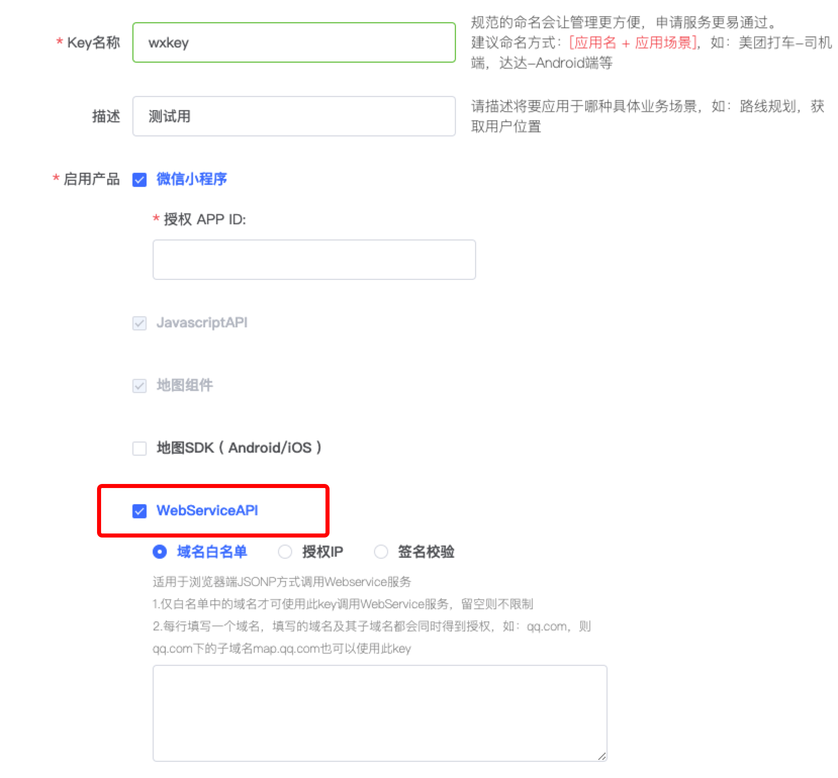 1. 腾讯地图开放平台 注册并生成key,腾讯地图要勾选 WebServiceAPI 不然会出现调用失败问题