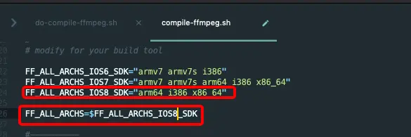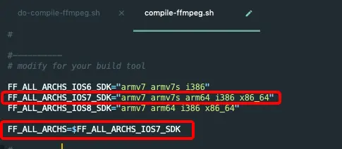#注意点:如果需要支持armv7s架构,则修改init-ios.sh中FF_ALL_ARCHS=$FF_ALL_ARCHS_IOS7_SDK